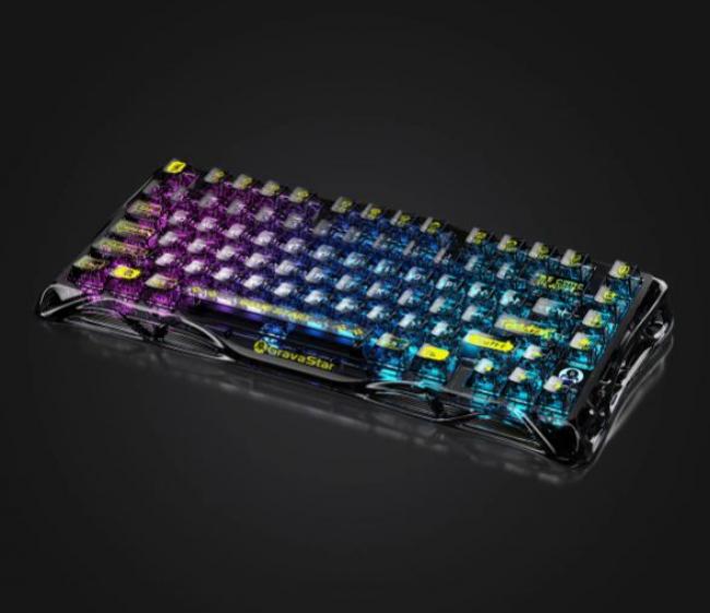 透明デザインを採用し、未来的なカッコよさのあるGravaStarの「K1Lite」。クリアなキーキャップとRGBバックライトによる美しい発光も特徴で、SFの世界にあるサイバーな魅力を感じるデザインですね。