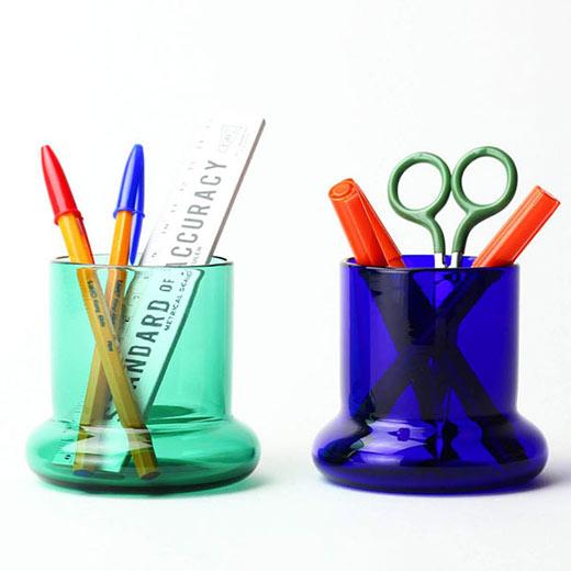 2016年に髙橋漠と和田朋子により、福岡県宗像市を拠点として立ち上げられたガラスウェアブランド「TOUMEI」と、HITIDEによるコラボのペンスタンドになります。透き通った美しい色合いのガラス印象的なペン立てです。ガラス製なのでプラスチックなどと比べて重量がありますので、安定感は期待できる判明、あまり高い所から落下させると割れるといった危険があるかもしれません。