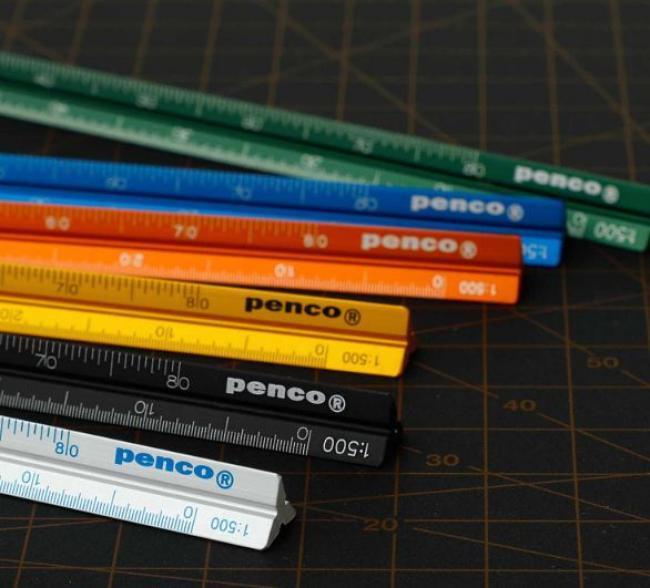 製図用の三角スケールに、大胆なカラーリングを施したpenco(ペンコ)のスケールツール。本来のドラフティングスケールは建築や設計で使うもので、図面を縮尺(スケール)で測るための道具なのですが、こちらもその流れを引き、1/100〜1/600みたいな複数の縮尺目盛りが入っています。