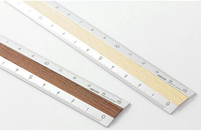 天然木とアルミ素材の融合から生まれた目盛りの消えない15㎝定規です。本体は軽くて丈夫なアルミを採用し、表面には天然木(ブナやブビンガ)を組み合わせ。金属のシャープさと、木の温もりが共存した素敵なデザインとなっています。