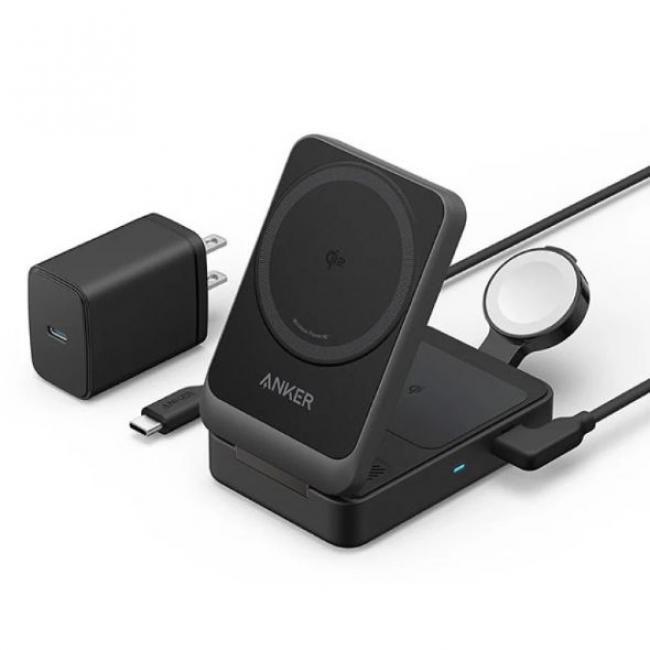 マグネット式ワイヤレス充電対応の3-in-1充電器「Anker MagGo Wireless Charging Station」。MagSafe対応のiPhone(iPhone 12以降など)を磁力でぴったり貼り付けて充電できるスマホスタンド型ワイヤレス充電ステーション として設計されています。